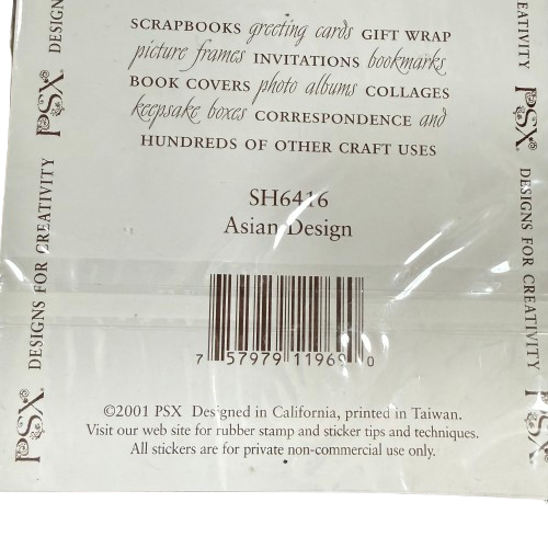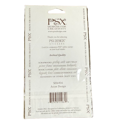 Vintage PSX Designs for Creativity sticker sheet featuring Japan-inspired imagery including a Geisha, dragon, koi fish, calligraphy, kimono, fans, and traditional motifs. Designed for scrapbooking and paper arts, these are archival quality and highly collectible among vintage craft enthusiasts.