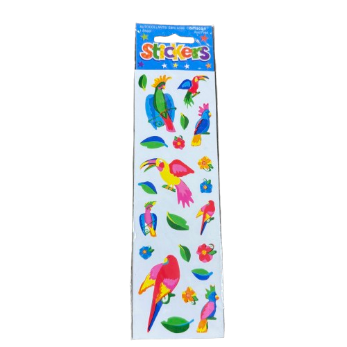 Vintage Amscan brand tropical parrot sticker sheet, new and sealed in original packaging. Features brightly colored parrots, leaves, and floral accents in a playful, high-saturation style typical of 1990s craft and party supplies.