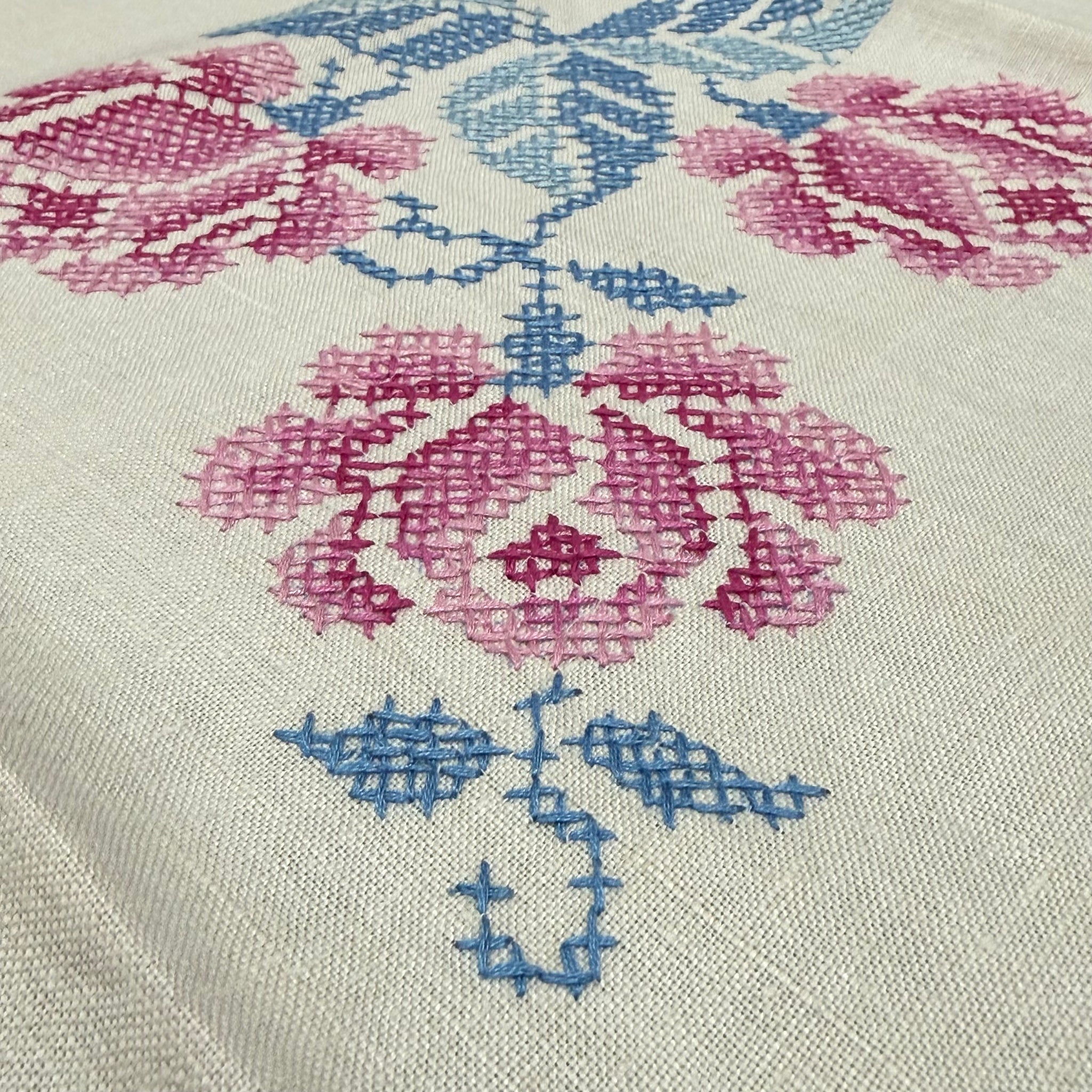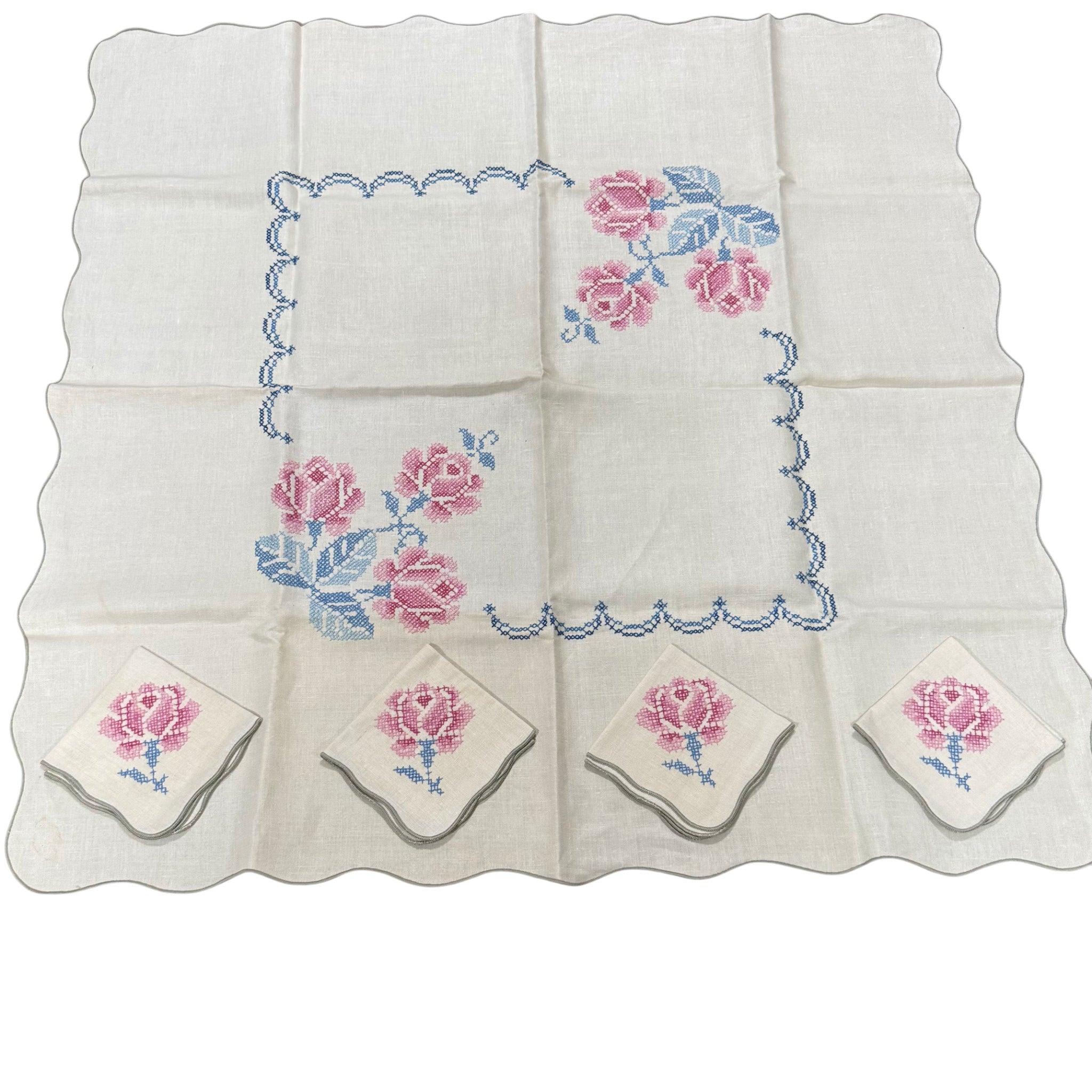 This vintage card table–size tablecloth set features delicate hand embroidery with pink rose motifs and blue scalloped detailing, paired with matching embroidered napkins. Crafted in a lightweight linen or linen-blend fabric, the set reflects classic mid-century floral needlework often used for bridge tables, tea tables, or intimate dining settings.