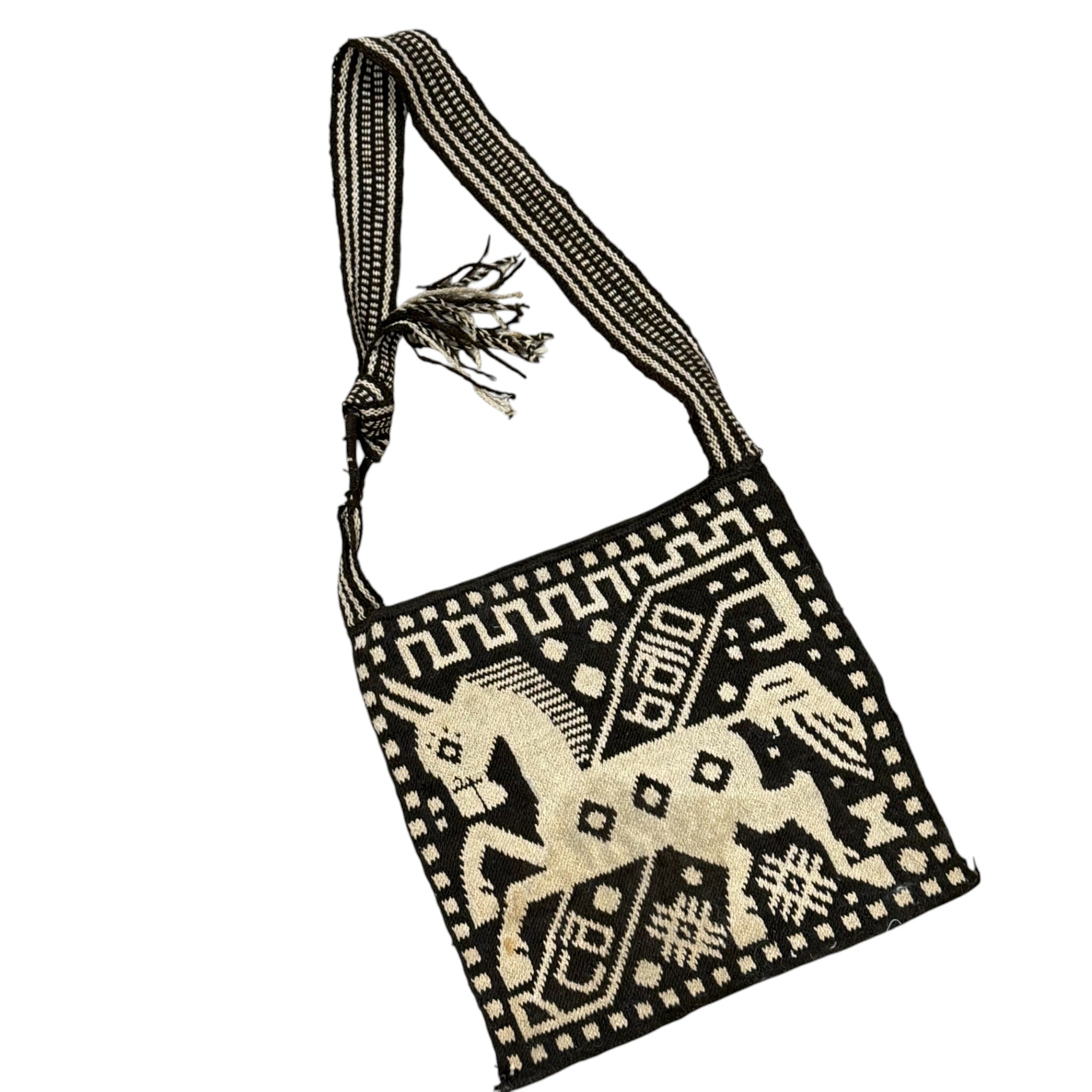 Beautiful vintage Andean woven tapestry shoulder bag featuring animal motifs and bold geometric patterns. Handcrafted in the 1970s–1980s by Andean artisans, this textile purse includes stylized alpacas/llamas and traditional border designs. The neutral brown and tan palette pairs well with boho, folk, and heritage styles.