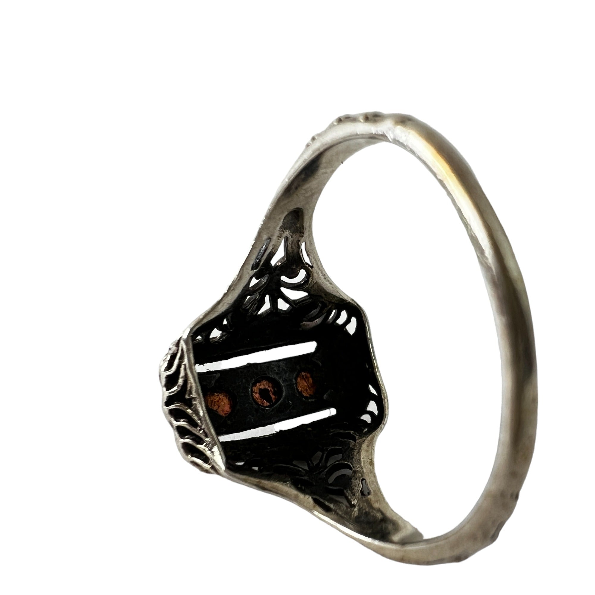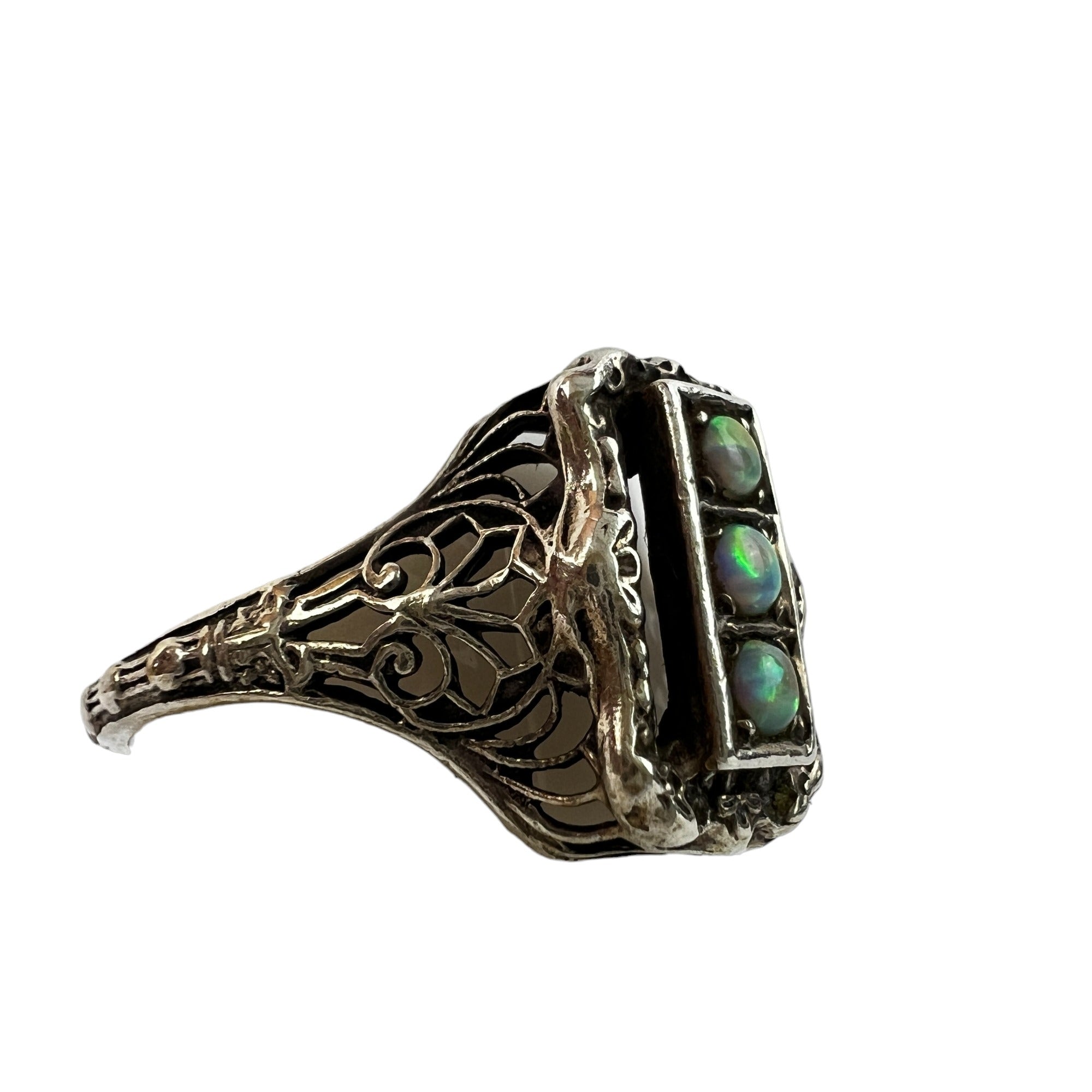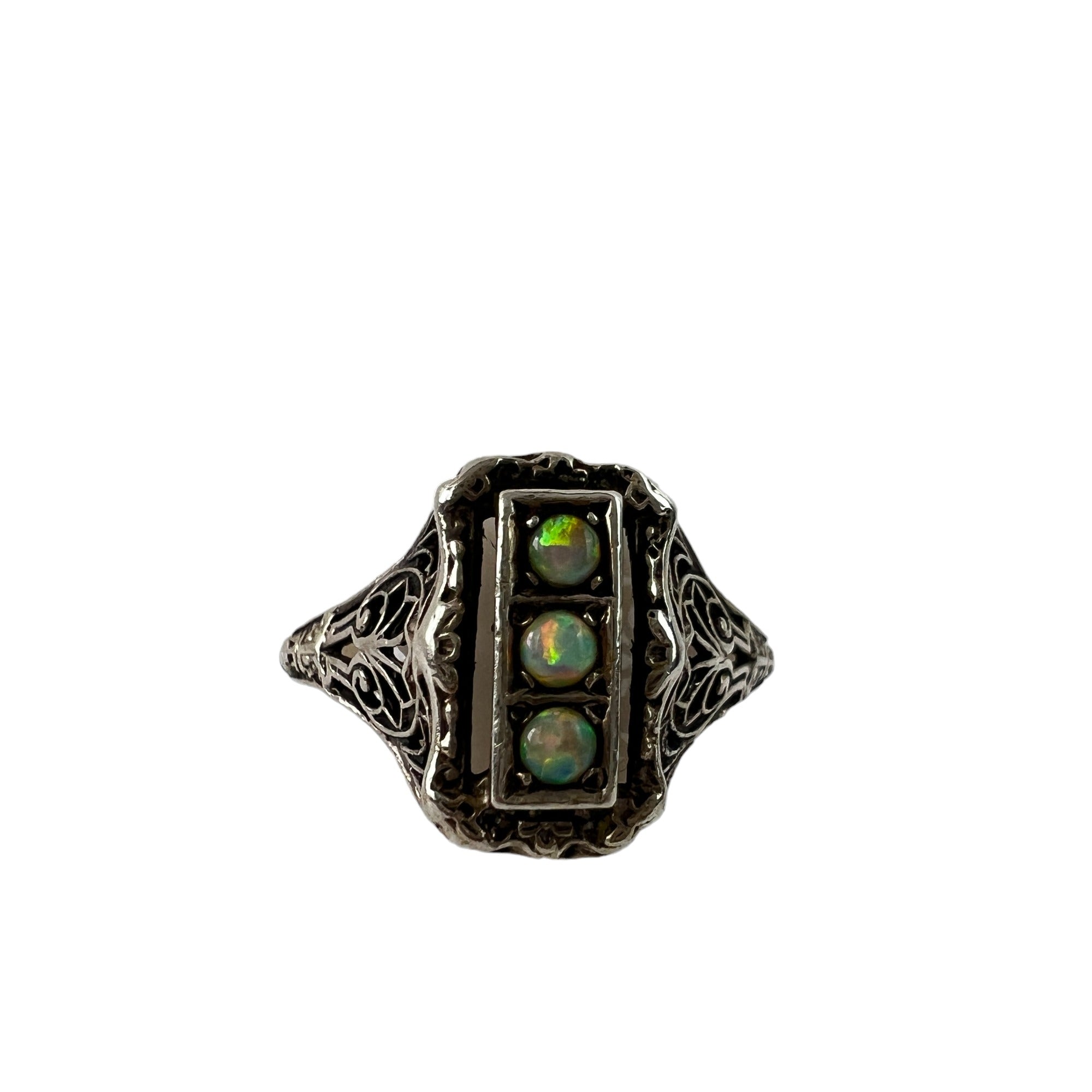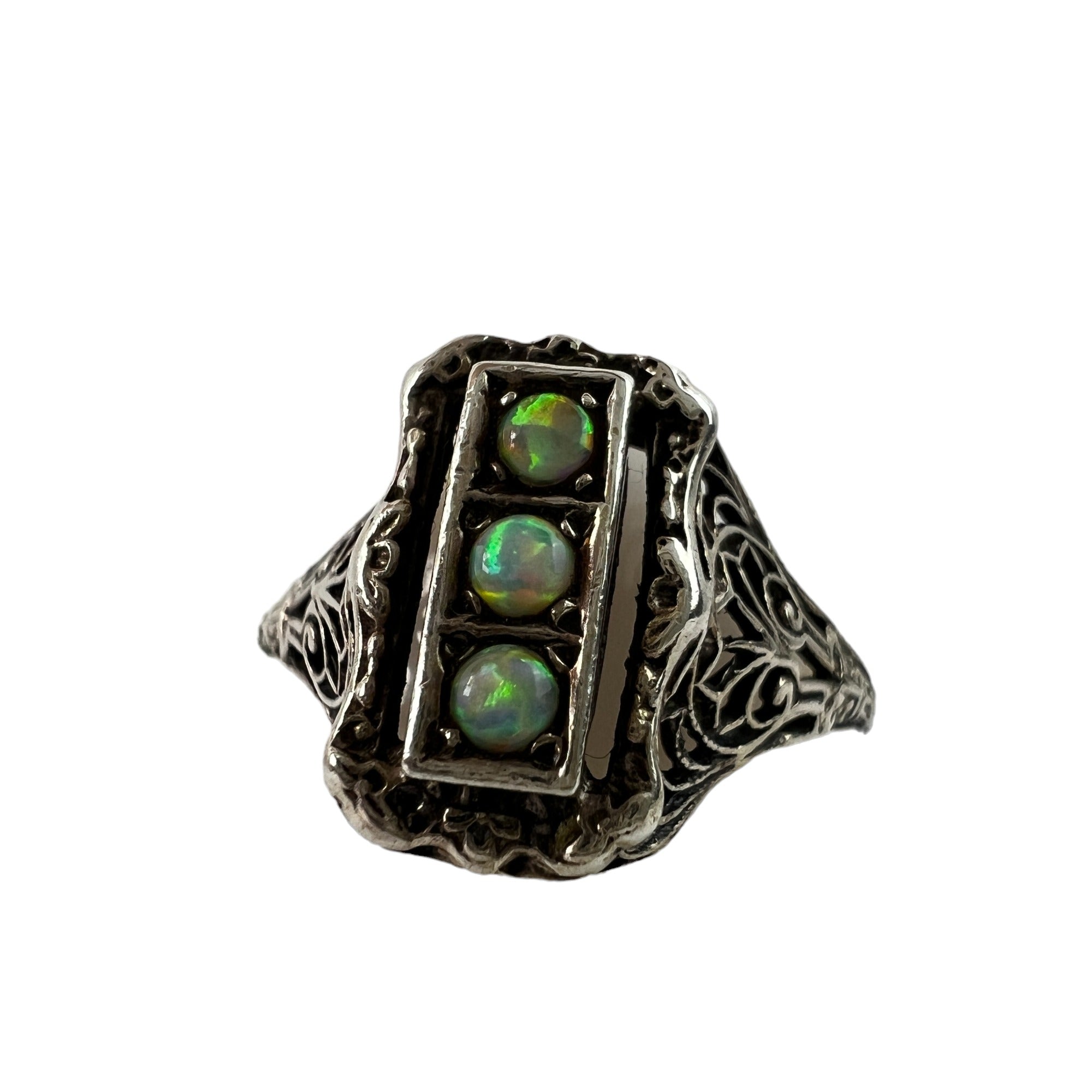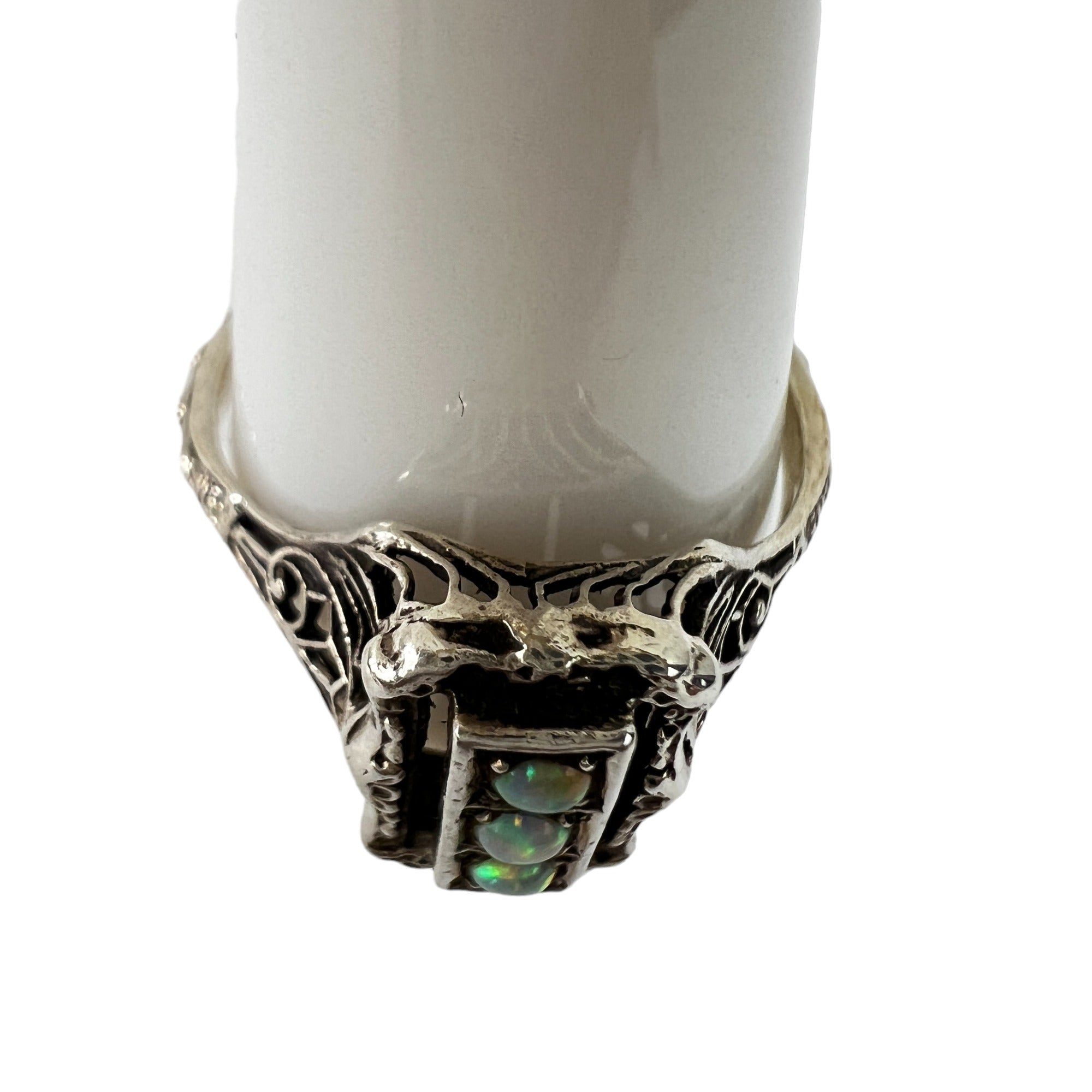 This exquisite piece combines the timeless charm of vintage design with the iridescent beauty of a green fire opal. Set in 925 sterling silver, the opal radiates captivating colors that shift with the light, creating a mesmerizing effect. The ring's classic silhouette and intricate detailing make it a versatile accessory for any occasion. Whether you're seeking a unique statement piece or a cherished addition to your jewelry collection, this vintage-inspired ring embodies elegance, natural beauty, and timeless sophistication.