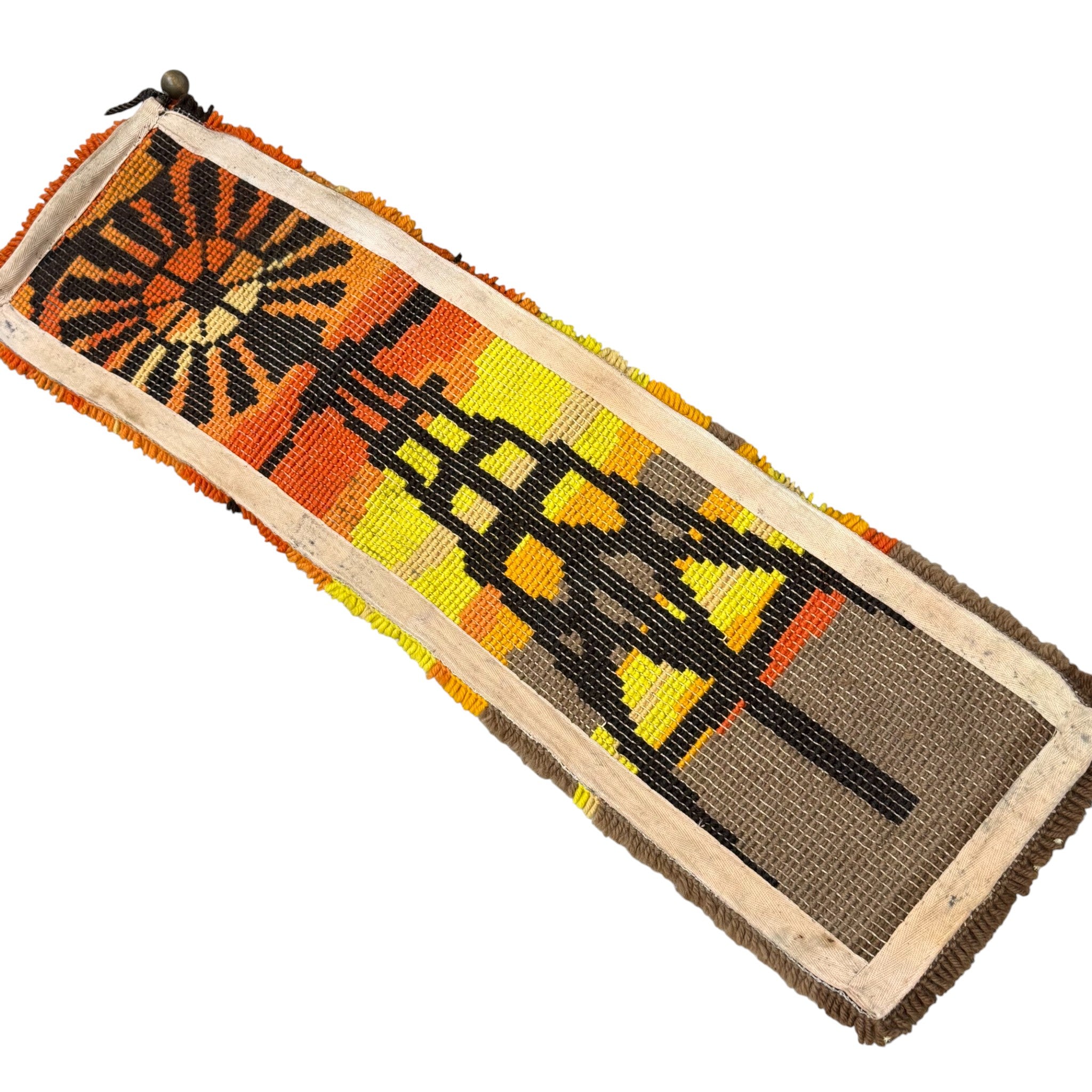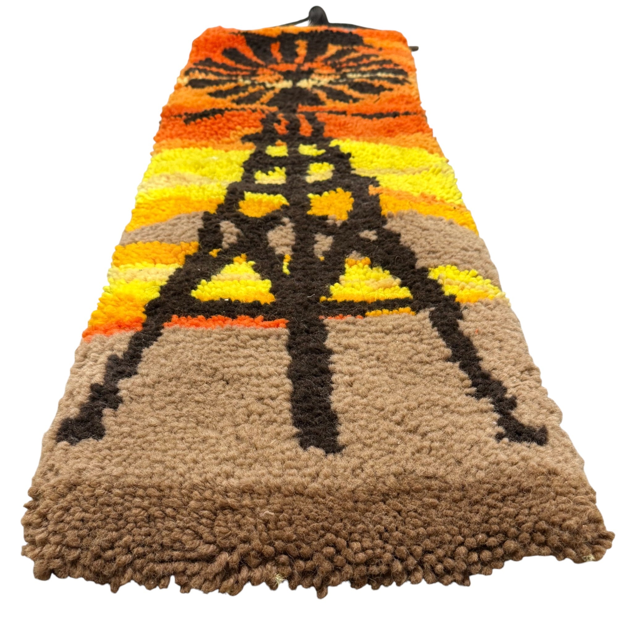 Beautiful vintage latch hook wall hanging from the 1970s featuring a windmill silhouette against a warm sunset background. Handcrafted with thick wool yarn on canvas, this long wall runner brings retro color and cozy texture to any space.