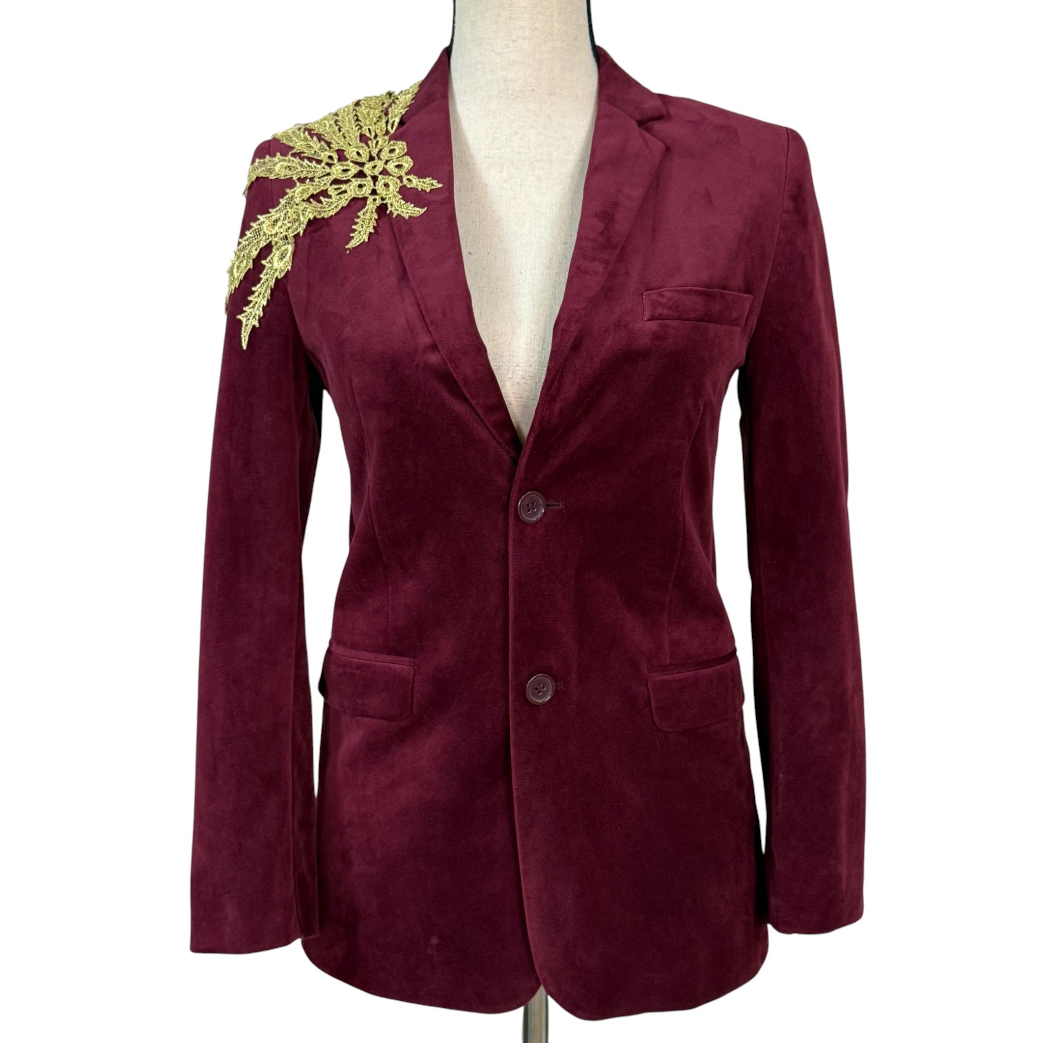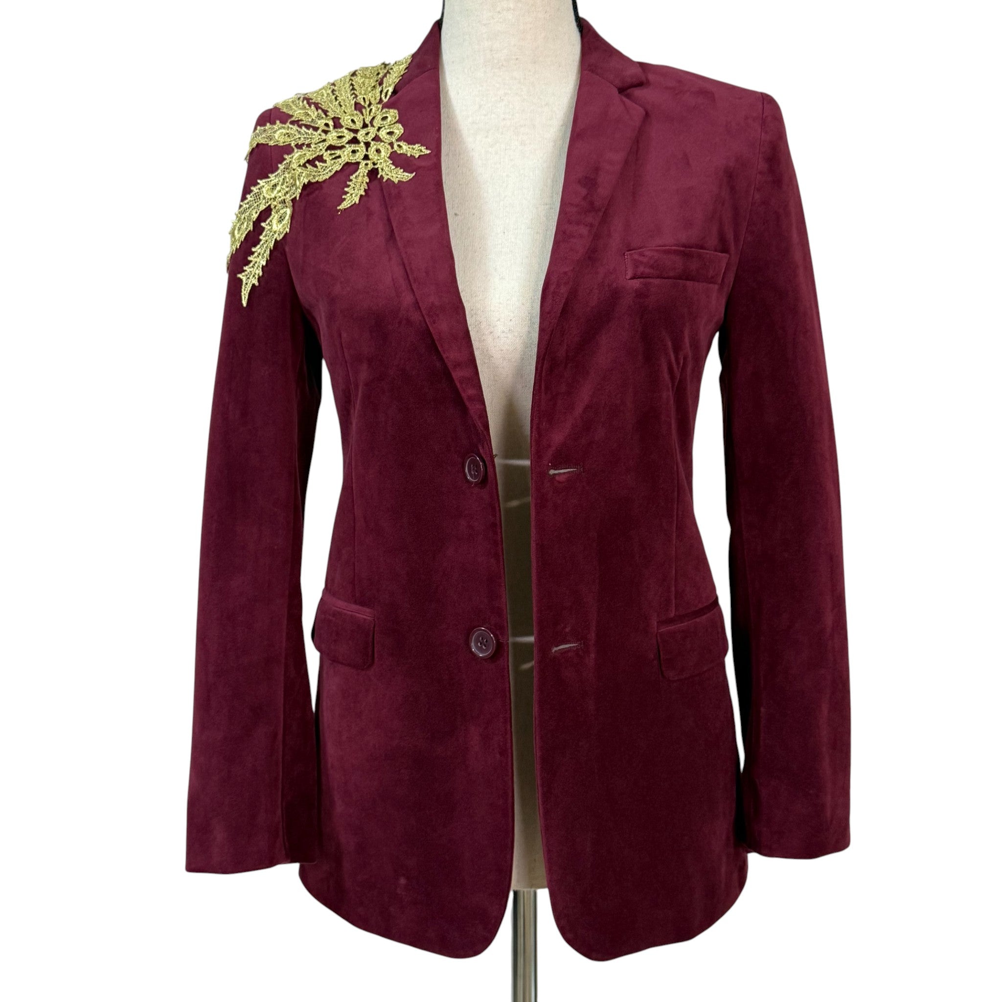 Sophisticated early 2000s Isaac Mizrahi New York blazer in a rich burgundy velvet. Features a dramatic DIY gold lace appliqué shoulder detail for a luxe, couture-inspired look. Fully lined with a metallic herringbone satin interior. Two-button closure, flap pockets, and a tailored silhouette that flatters and elevates any outfit.