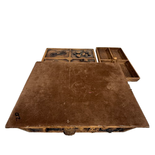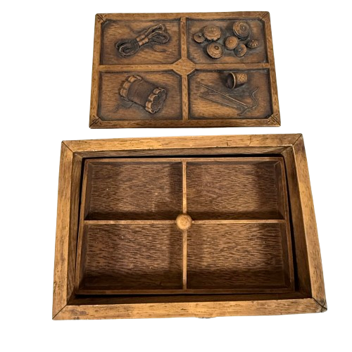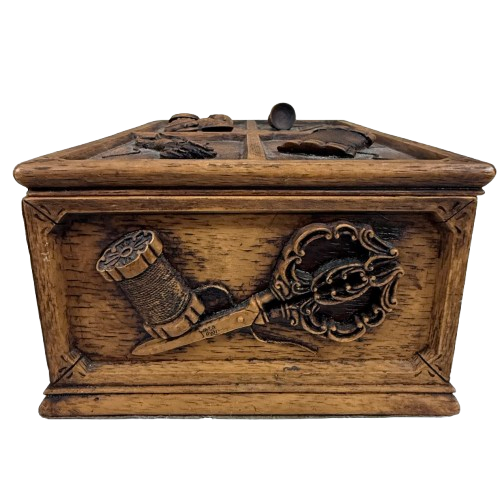 Crafted from heavy molded resin designed to emulate hand-carved wood, this box features raised figural and tool motifs, a removable lid, and a fully intact compartmentalized interior for organizing sewing accessories.