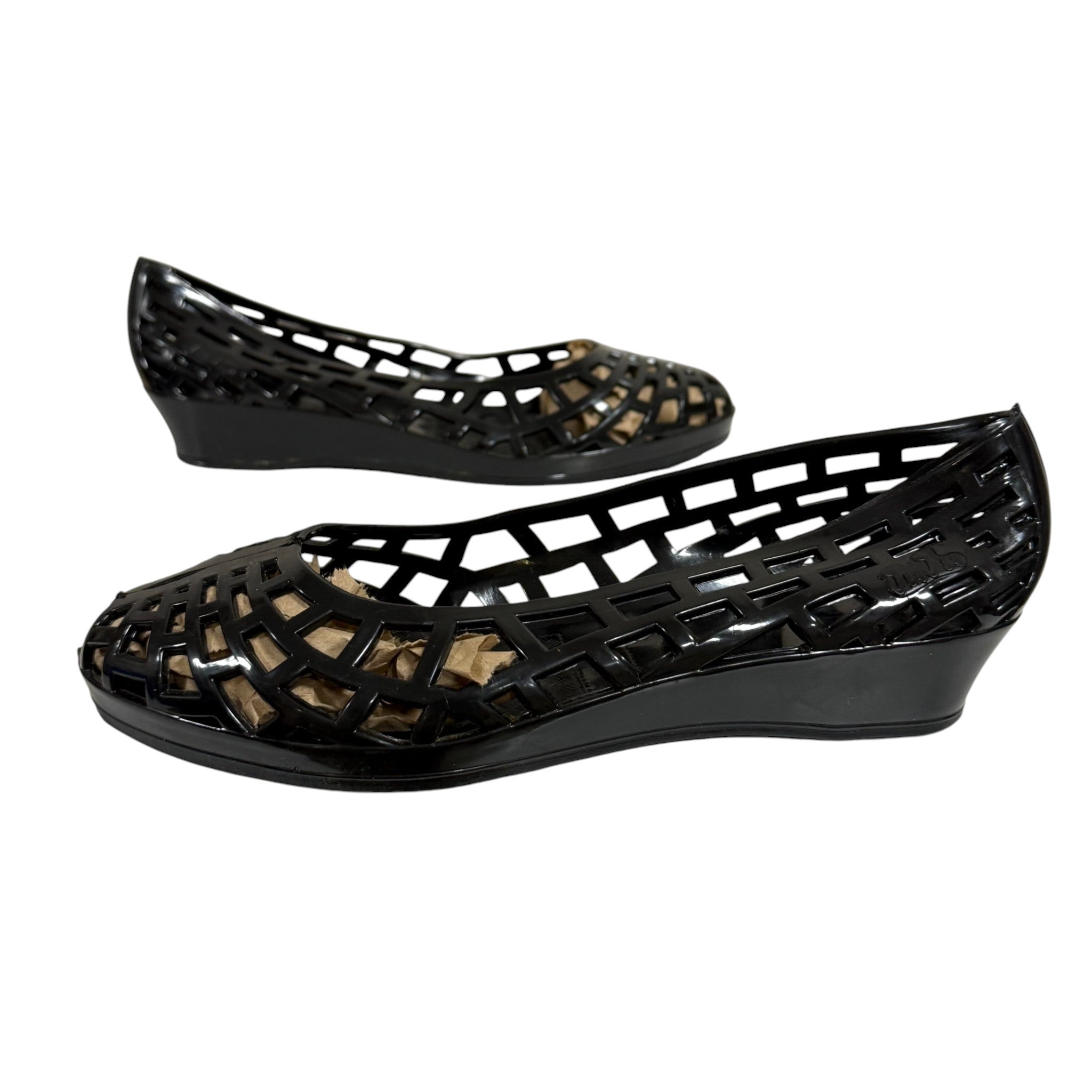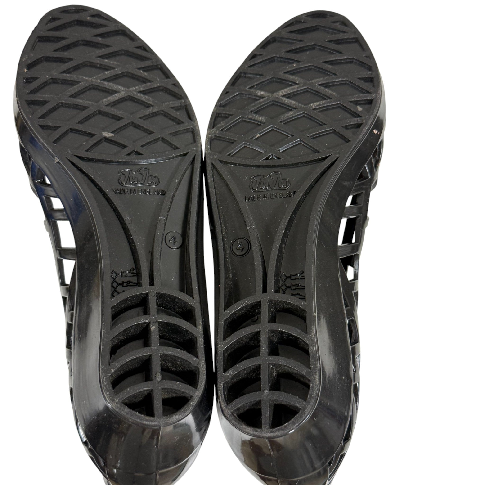 Classic JuJu Made in England black jelly flats featuring a lattice cage design, peep toe front, and flexible molded rubber construction. These are the original UK-made jellies, known for higher quality than modern fast-fashion versions. Lightweight, waterproof, and perfect for 90s nostalgia lovers, festivals, beachwear, or collector wardrobes.
