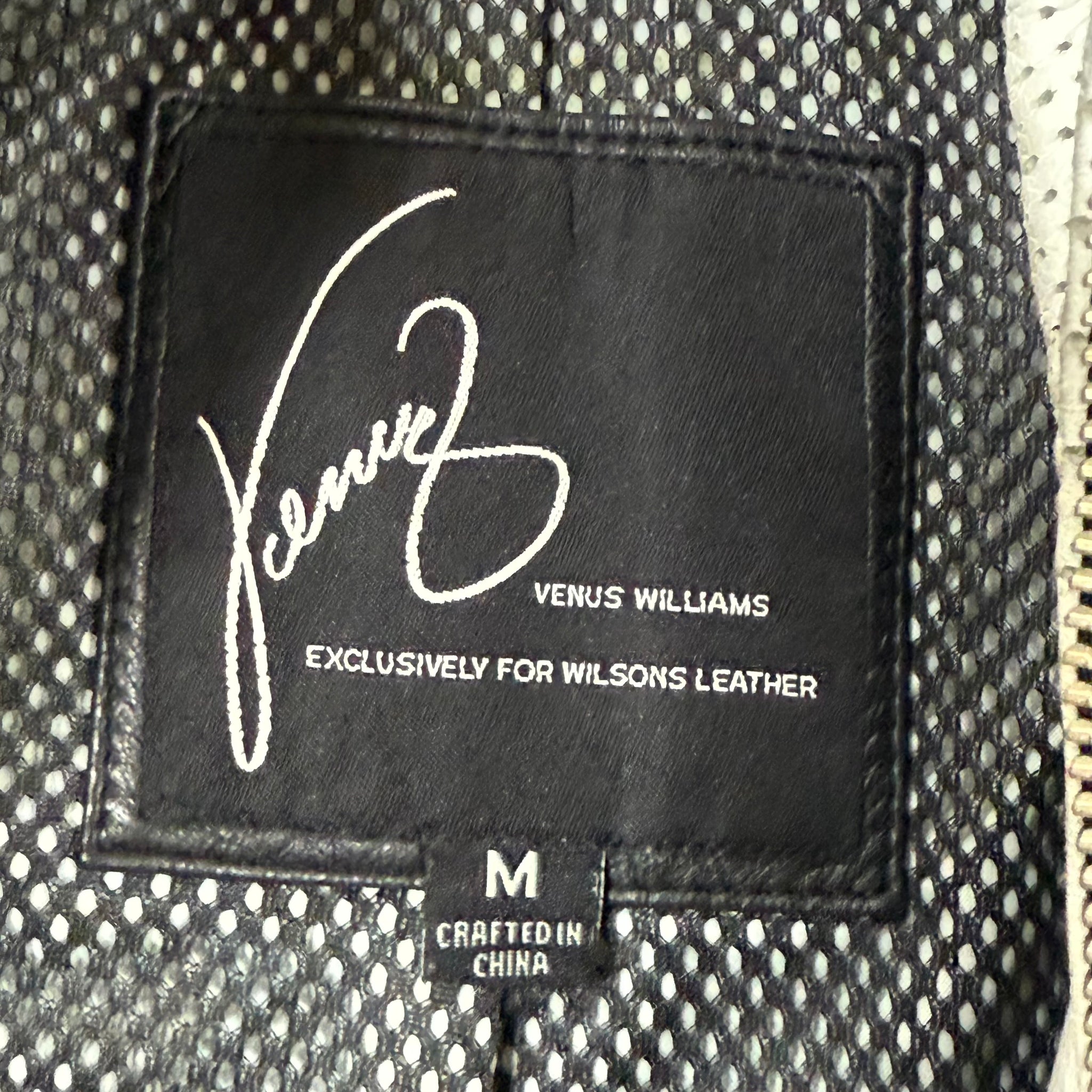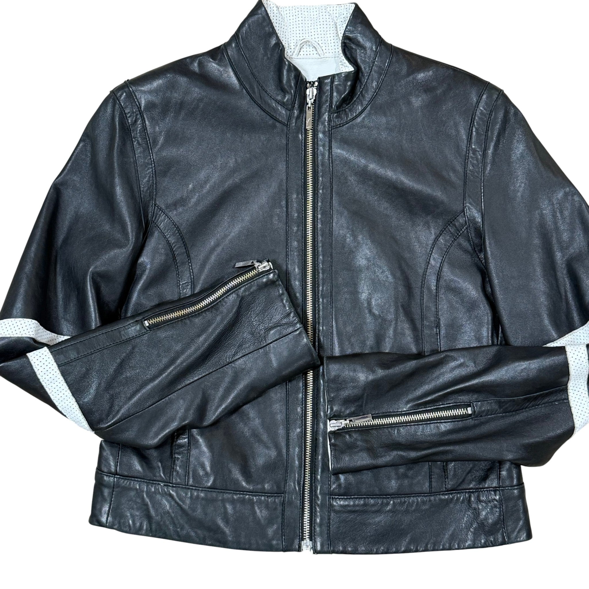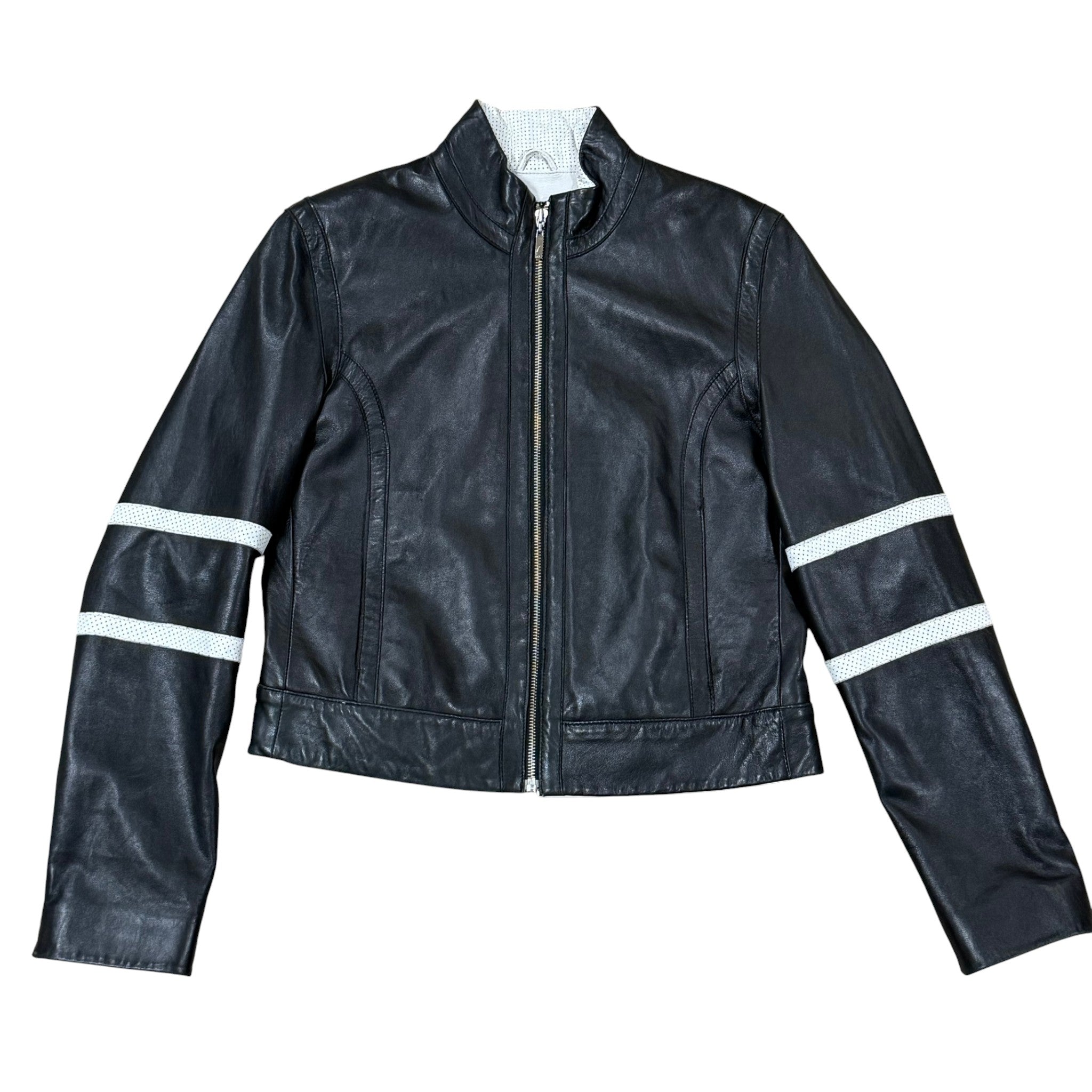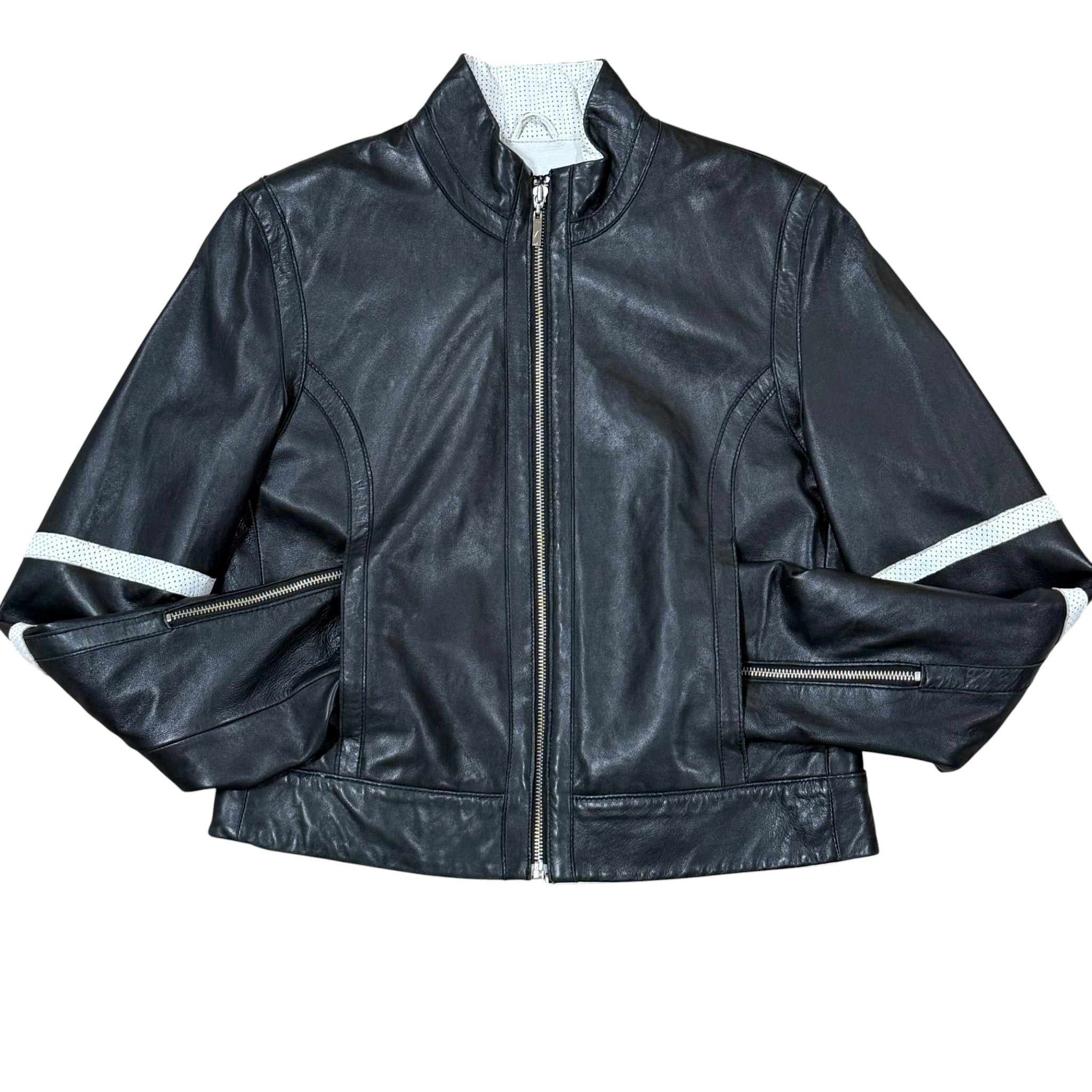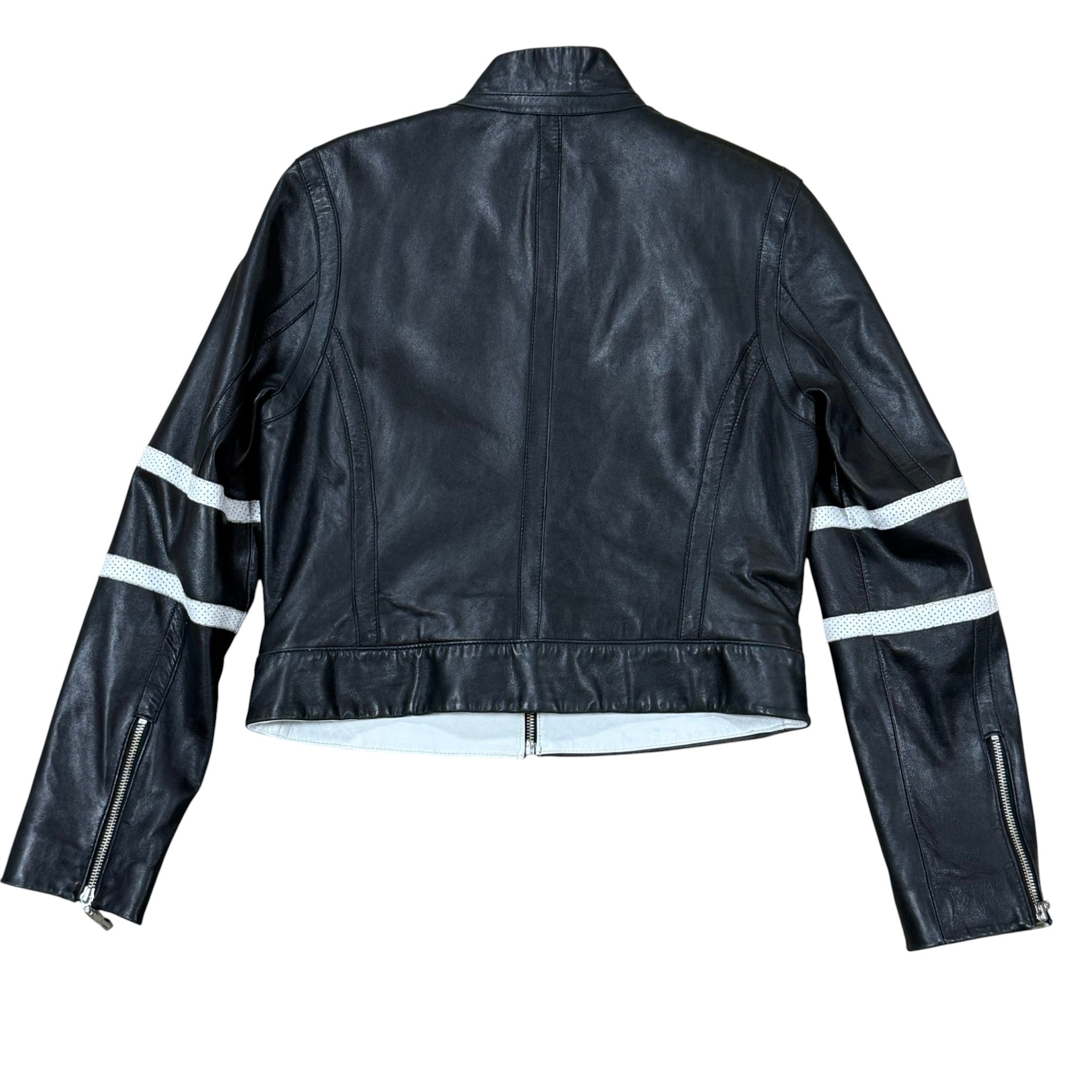 Sporty and sophisticated, this Venus Williams for Wilsons Leather jacket is crafted from supple genuine leather with bold white perforated racing stripes along each sleeve. A modern moto cut gives it a sleek, fitted shape perfect for casual or elevated styling. This collaboration between Venus Williams and Wilsons Leather was part of a limited designer collection released around the mid-2000s. The sporty racer-style silhouette and white stripe detailing on the sleeves reflect that period’s athleisure-meets-luxury aesthetic.